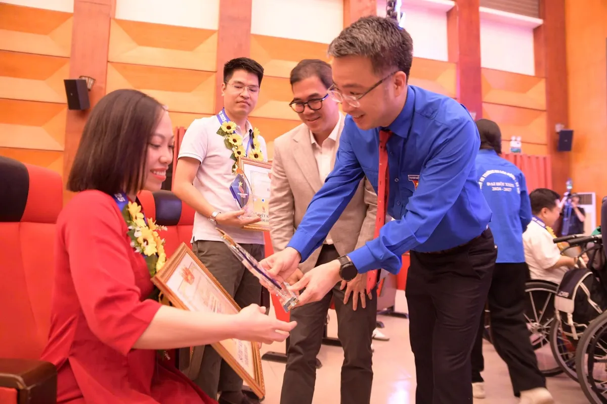 Đồng chí Bùi Quang Huy - Ủy viên dự khuyết Trung ương Đảng, Bí thư thứ nhất Trung ương Đoàn, Phó chủ tịch Ủy ban Trung ương Mặt trận Tổ quốc Việt Nam - trao vinh danh thanh niên khuyết tật tiêu biểu tại buổi lễ
