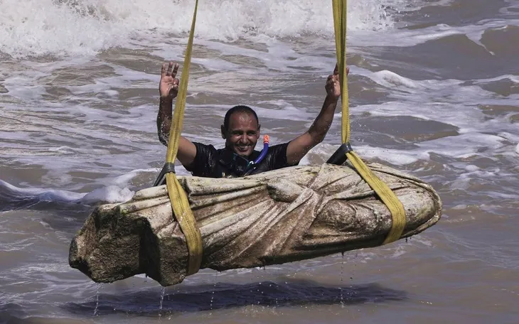 Thợ lặn mừng rỡ sau khi trục vớt một cổ vật tại Vịnh Abu Qir, Alexandria, Ai Cập ngày 21/8/2025 (Ảnh: AP)