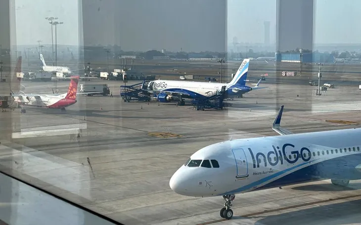 Hai máy bay của IndiGo tại sân bay Indira Gandhi ở New Delhi khi nhiều chuyến bay của hãng bị hủy hoặc chậm ngày 4/12/2025 (Ảnh: AP)