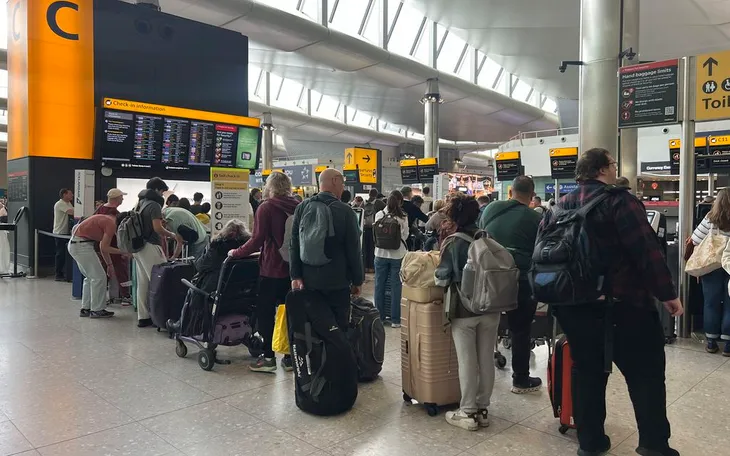 Hành khách xếp hàng tại nhà ga T2 sân bay Heathrow, London (Anh) sau khi nhiều chuyến bay bị hoãn và hủy do nghi bị tấn công mạng ngày 20/9/2025 (Ảnh: AP)