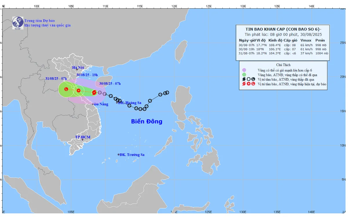 Đến 19h ngày 30/8, bão trên khu vực đất liền các tỉnh từ Hà Tĩnh đến Bắc Quảng Trị, di chuyển theo hướng Tây Tây Bắc với tốc độ khoảng 20km/h với sức gió mạnh cấp 7, giật cấp 9 đi vào đất liền các tỉnh Hà Tĩnh - Bắc Quảng Trị và suy yếu dần thành áp thấp nhiệt đới. Khu vực chịu ảnh hưởng là phía Tây khu vực Bắc Biển Đông, vùng biển từ Thanh Hóa đến thành phố Đà Nẵng (bao gồm đảo Hòn Ngư, đặc khu Cồn Cỏ). Cấp độ rủi ro thiên tai cấp 3.