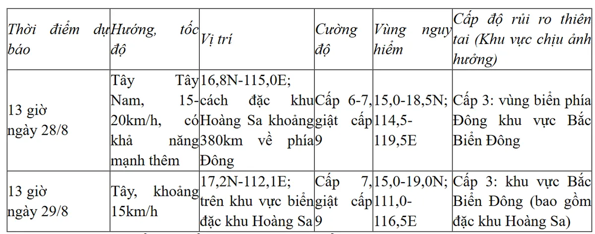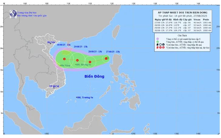 Hồi 13 giờ ngày 27/8, vị trí tâm áp thấp nhiệt đới ở vào khoảng 17,6 độ Vĩ Bắc; 118,7 độ Kinh Đông trên vùng biển phía Đông khu vực Bắc Biển Đông. Sức gió mạnh nhất vùng gần tâm áp thấp nhiệt đới mạnh cấp 6 (39-49km/giờ), giật cấp 8. Di chuyển theo hướng Tây Tây Nam với tốc độ 10-15km/h.