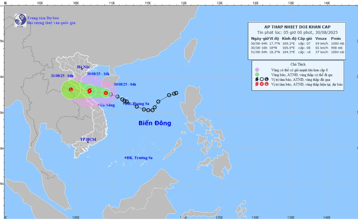 Theo Trung tâm Dự báo Khí tượng Thủy văn Quốc gia, hồi 4h ngày 30/8, vị trí tâm áp thấp nhiệt đới ở 17,7°N – 109,2°E, trên vùng biển phía Tây Bắc đặc khu Hoàng Sa; cách Bắc Quảng Trị khoảng 290km về phía Đông Đông Nam. Sức gió mạnh nhất vùng gần tâm áp thấp nhiệt đới mạnh cấp 7 (50-61 km/giờ), giật cấp 9. Di chuyển hướng Tây Bắc, tốc độ 20km/h.