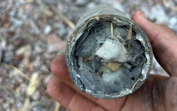 Dải ruy băng nylon trắng từ tàn tích một quả bom chùm, dùng để ổn định và xoay bom nhỏ (Ảnh: The Guardian)