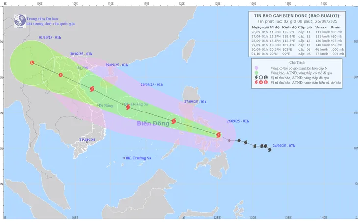 Bản đồ dự báo quỹ đạo và cường độ bão Bualoi phát lúc 2h00 ngày 26/9/2025. Ảnh: Trung tâm KTTV Quốc gia
