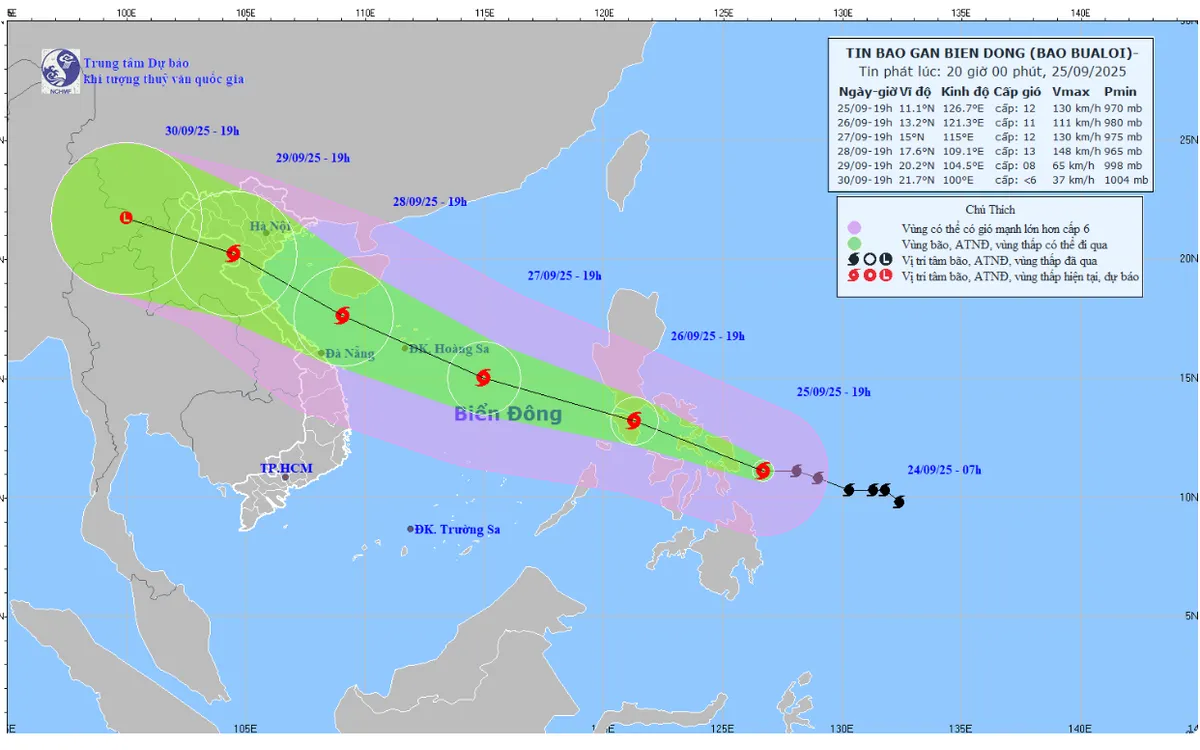 19h ngày 28/9: đi Tây Tây Bắc 25–30 km/h, khả năng mạnh thêm. Vị trí 17,6°N–109,1°E, sức gió cấp 12–13, giật cấp 16. ▪ Vùng nguy hiểm: vĩ tuyến 12,5–19,5°N; kinh tuyến 107,0–118,0°E. ▪ Cấp độ rủi ro thiên tai: cấp 3 (Bắc & Giữa Biển Đông, Hoàng Sa, vùng biển Quảng Trị đến Quảng Ngãi).