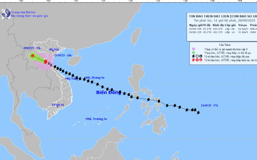 Hồi 10h ngày 29/9, vị trí tâm bão ở vào khoảng 19,1 độ Vĩ Bắc; 104,5 độ Kinh Đông, trên đất liền khu vực biên giới Nghệ An - Trung Lào. Sức gió mạnh nhất vùng gần tâm bão mạnh cấp 8 (62 - 74km/h), giật cấp 10. Di chuyển theo hướng Tây Tây Bắc, tốc độ khoảng 20km/h.