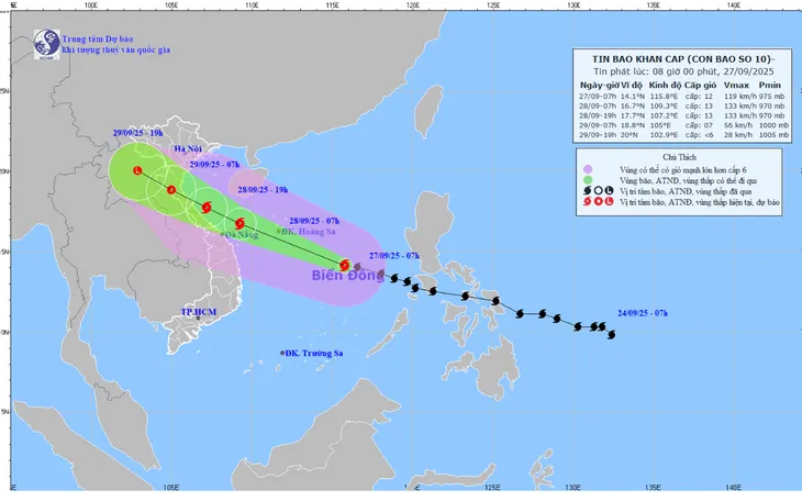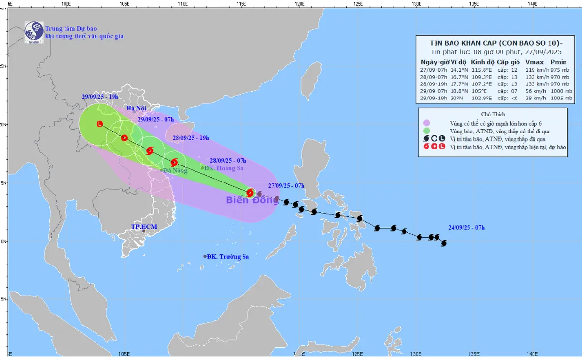 Theo Trung tâm Dự báo khí tượng thủy văn Quốc gia, hồi 7h ngày 27/9, vị trí tâm bão số 10 ở vào khoảng 14,1 độ Vĩ Bắc; 115,8 độ Kinh Đông, cách đặc khu Hoàng Sa khoảng 480 km về phía Đông Đông Nam. Sức gió mạnh nhất vùng gần tâm bão mạnh cấp 11-12 (103 - 133km/h), giật cấp 15. Di chuyển theo hướng Tây Tây Bắc với tốc độ 35 - 40km/h.
