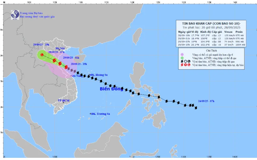 Hồi 19 giờ ngày 28/9, vị trí tâm bão vào khoảng 17,7 độ Vĩ Bắc; 107,2 độ Kinh Đông, trên vùng ven biển Nghệ An - Quảng Trị. Sức gió mạnh nhất vùng gần tâm bão cấp 12 (118-133 km/giờ), giật cấp 15, di chuyển theo hướng Tây Tây Bắc với tốc độ 20-25 km/h. Đây là cơn bão di chuyển nhanh, cường độ mạnh, phạm vi ảnh hưởng rộng, có thể gây tác động tổng hợp của nhiều loại hình thiên tai: gió mạnh, sóng lớn, mưa to, lũ, lũ quét, sạt lở đất và ngập lụt ven biển.