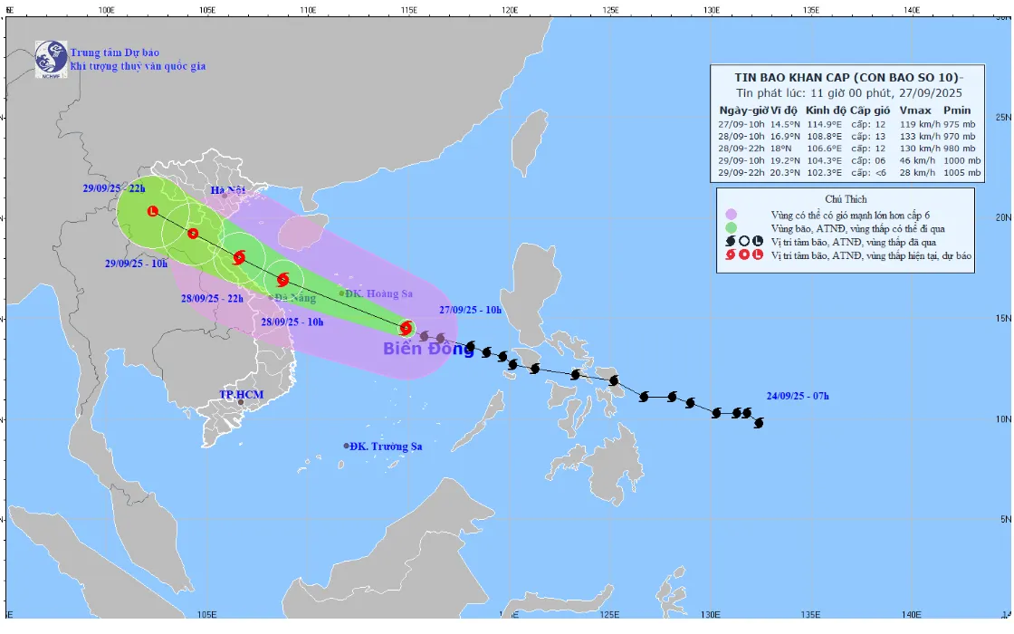 Từ đêm 27–30/9: Bắc Bộ và Thanh Hóa – Quảng Ngãi mưa 100–300mm, cục bộ >450mm. Riêng đồng bằng Bắc Bộ, Nam Phú Thọ và Thanh Hóa – Bắc Quảng Trị: 200–400mm, cục bộ >600mm.