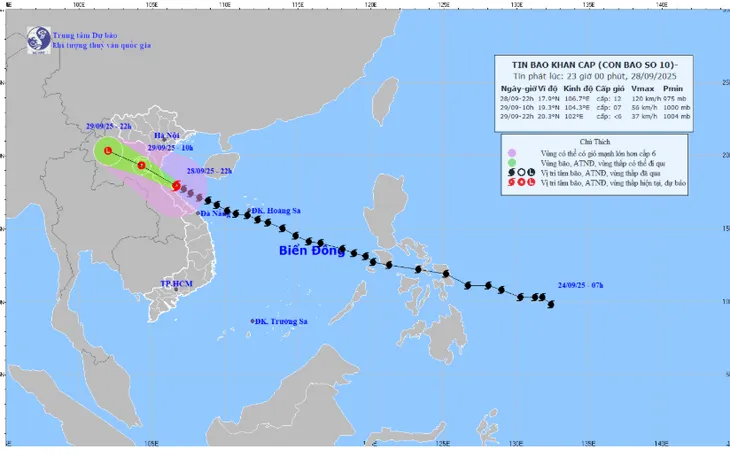 Lúc này, tâm bão số 10 một nửa nằm trên biển, một nửa đã trên đất liền khu vực phía Bắc Quảng Trị. Trong 1-2 tiếng tới, bão dự kiến đổ bộ hoàn toàn vào đất liền, mang theo gió mạnh và mưa lớn.