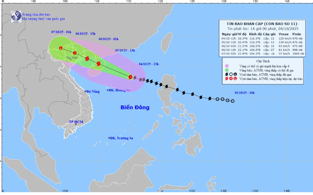 Hồi 13h ngày 04/10, vị trí tâm bão ở vào khoảng 18,3 độ Vĩ Bắc; 115,3 độ Kinh Đông, trên khu vực Bắc Biển Đông, cách đảo Hải Nam (Trung Quốc) khoảng 500km về phía Đông Đông Nam. Sức gió mạnh nhất vùng gần tâm bão mạnh cấp 11-12 (103-133km/giờ), giật cấp 15. Bão di chuyển theo hướng Tây Tây Bắc với tốc độ khoảng 25km/h.