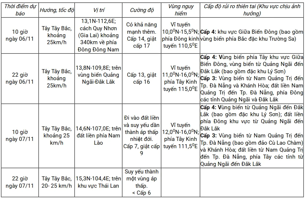 - Từ gần sáng ngày 06/11, vùng biển từ Nam Quảng Trị đến Khánh Hòa (bao gồm đặc khu Lý Sơn, đảo Cù Lao Chàm) gió mạnh dần lên cấp 6-7, sau tăng lên cấp 8-11, vùng gần tâm bão đi qua mạnh cấp 12-14, giật cấp 17; vùng ven biển từ TP. Huế đến Đắk Lắk sóng biển cao 4,0-6,0m, vùng gần tâm bão cao 6,0-8,0m; biển động dữ dội.