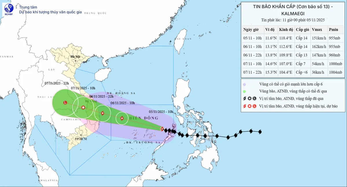 Hồi 10h ngày 5/11, vị trí tâm bão số 13 ở vào khoảng 11,6 độ Vĩ Bắc; 118,4 độ Kinh Đông, cách đảo Song Tử Tây khoảng 450km về phía Đông. Sức gió mạnh nhất vùng gần tâm bão mạnh cấp 13-14 (134-166 km/giờ), giật cấp 17. Di chuyển theo hướng Tây Tây Bắc với tốc độ khoảng 20km/h.