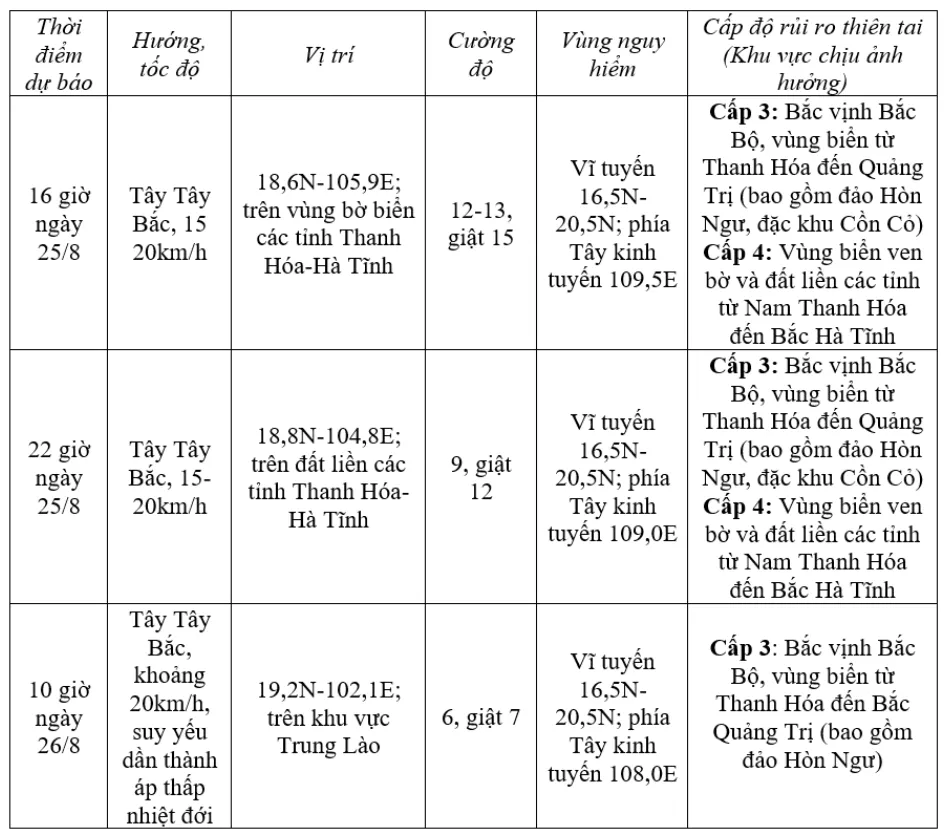 - Từ trưa 25/8 đến hết ngày 26/8, ở khu vực trung du và đồng bằng Bắc Bộ, khu vực Lào Cai, Sơn La và từ Thanh Hóa đến Quảng Trị có mưa lớn diện rộng với lượng mưa phổ biến 100-150mm, cục bộ có nơi trên 250mm; riêng khu vực Thanh Hóa đến Bắc Quảng Trị có mưa to đến rất to với lượng mưa phổ biến 200-400mm, cục bộ có nơi trên 600mm. Cảnh báo nguy cơ mưa có cường suất lớn (>200mm/3h).