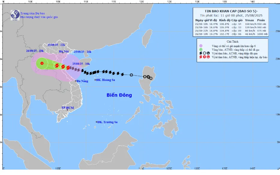 Hồi 10 giờ ngày 25/8, vị trí tâm bão ở vào khoảng 18,4 độ Vĩ Bắc; 106,8 độ Kinh Đông, cách Nghệ An khoảng 120km về phía Đông Đông Nam, cách Hà Tĩnh khoảng 100km về phía Đông, cách Bắc Quảng Trị khoảng 130km về phía Đông Đông Bắc. Sức gió mạnh nhất vùng gần tâm bão mạnh cấp 13-14 (134-166km/giờ), giật cấp 17; di chuyển theo hướng Tây Tây Bắc với tốc độ 15-20km/giờ.