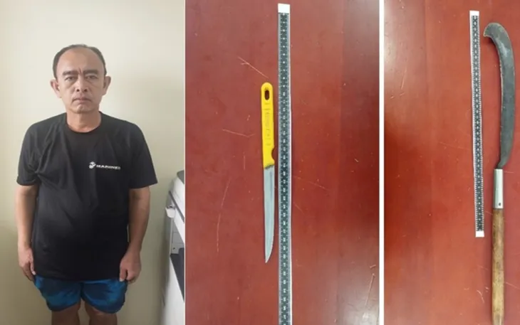 Đối tượng Ngô Văn Thuận cùng với hung khí thu giữ. Ảnh: Công an tỉnh Lâm Đồng