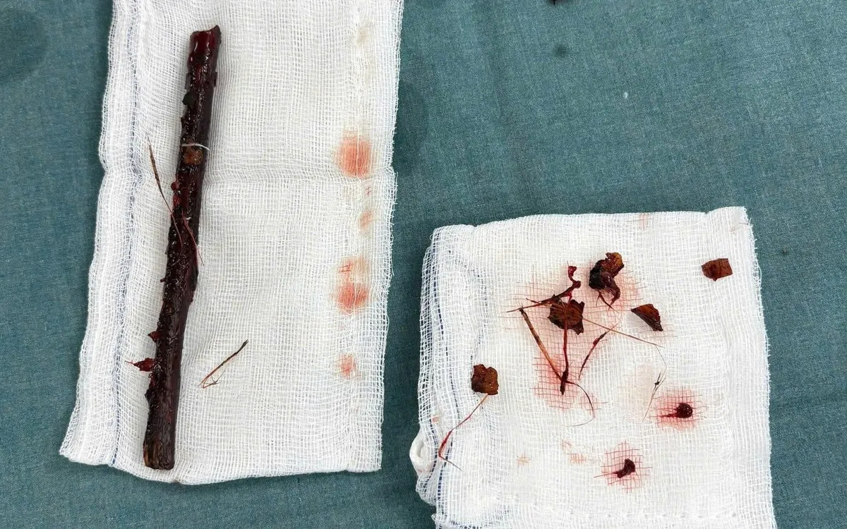 Ekip mổ xác định cành cây xuyên trực tràng, ruột non và tá tràng, gây viêm dính. Các bác sĩ phải mổ mở, bóc tách tỉ mỉ, khâu vết thương và làm hậu môn tạm. Sau 4 giờ phẫu thuật, cành cây được lấy ra nguyên vẹn, bé tỉnh táo, hồi phục tốt và dự kiến xuất viện sau 1 tuần.