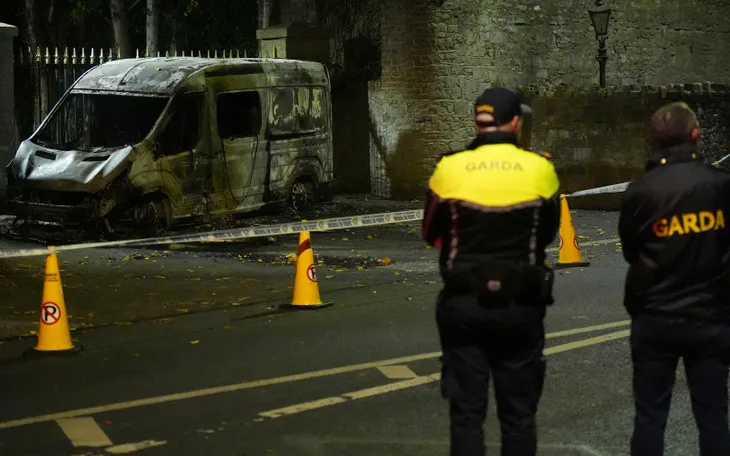Xe cảnh sát bị cháy gần khách sạn Citywest, nơi xảy ra vụ biểu tình bạo hỗn loạn ở Dublin (Ảnh: AP)