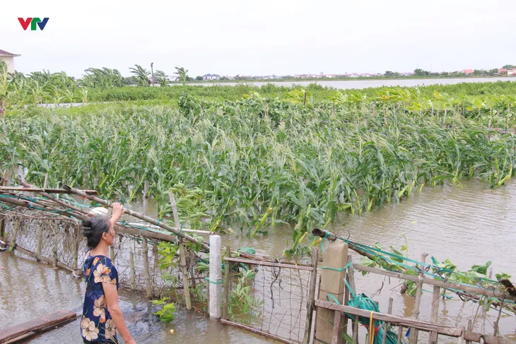 Một người dân bất thần nhìn vườn ngô nếp, rau màu, giàn bí… của gia đình ngập sâu trong nước. Bà bảo, nước sông Ninh Cơ lên dâng cao, tràn vào vườn bãi của gia đình, gây thiệt hại nặng nề.