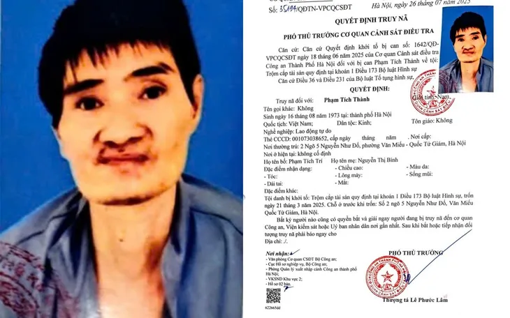 Cơ quan CSĐT Công an TP Hà Nội đã ra quyết định truy nã đối tượng Phạm Tích Thành (SN: 1973; thường trú tại: ngõ 5 Nguyễn Như Đổ, phường Văn Miếu - Quốc Tử Giám, TP Hà Nội) về tội Trộm cắp tài sản.
