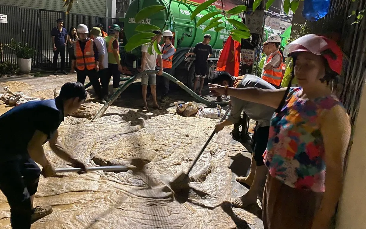 Bùn tràn ra ngõ Núi Trúc, người dân kịp thời thông báo đến lực lượng chức năng. Ảnh: Báo Tin tức