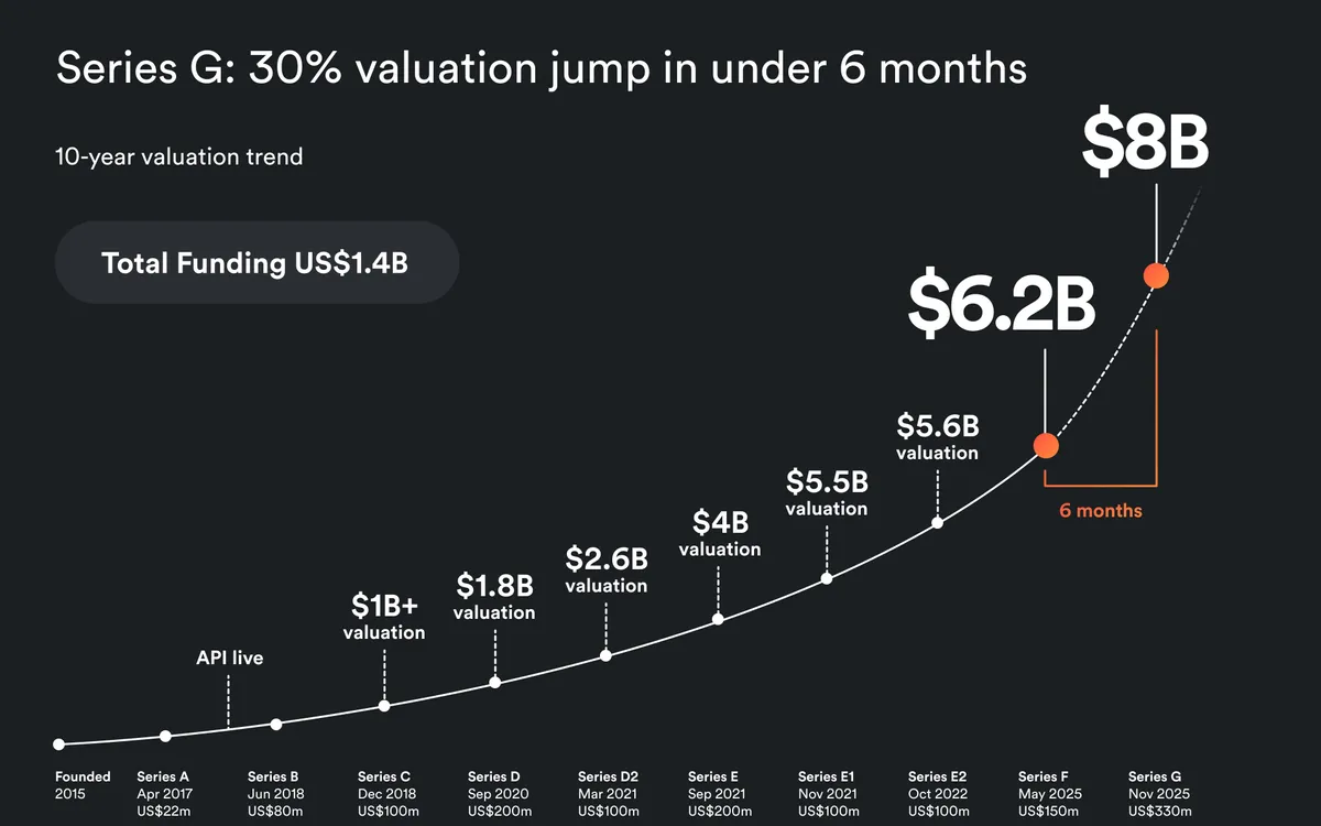 Theo Financial Times, Airwallex, vừa huy động thành công 330 triệu USD trong vòng gọi vốn Series G. Thương vụ này đưa giá trị của Airwallex lên 8 tỷ USD, tăng khoảng 30% so với vòng Series F cách đây sáu tháng.