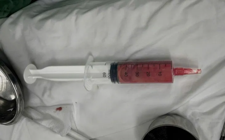 Dịch mủ được hút ra từ mô vú trong ca phẫu thuật. Ảnh: BVCC