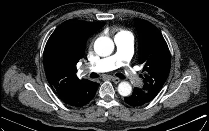 Hình ảnh chụp CT mạch máu phổi cho thấy huyết khối lớn bít tắc động mạch phổi hai bên. Ảnh: BVCC