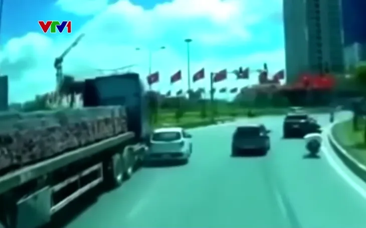 Đúng lúc này, một xe tải trọng lớn đang lưu thông ở làn ngoài cùng sát dải phân cách bất ngờ va chạm mạnh với xe con màu trắng. Cú đâm đã khiến chiếc xe con bị đẩy đi một đoạn xa, gây ra tình huống nguy hiểm trên đường.