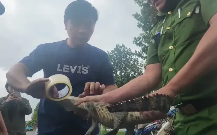 Con cá sấu đã được lực lượng chức năng bắt đưa lên bờ an toàn. (Nguồn: PLO)