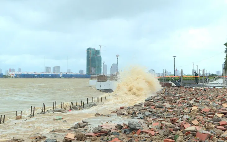 Bờ kè tuyến đường ven sông Hàn bị hư hỏng nặng do nước dâng cao và triều cường.