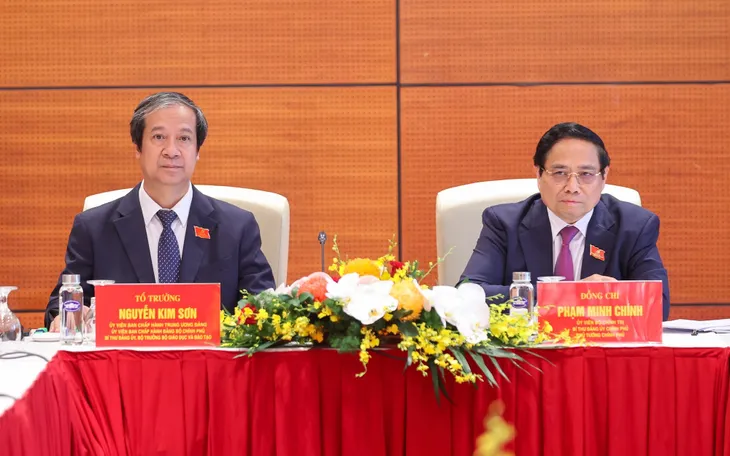 Thủ tướng Phạm Minh Chính và Bộ trưởng Bộ Giáo dục và Đào tạo Nguyễn Kim Sơn thảo luận tại tổ về các văn kiện Đại hội và dự thảo các văn kiện trình Đại hội XIV của Đảng - Ảnh: VGP