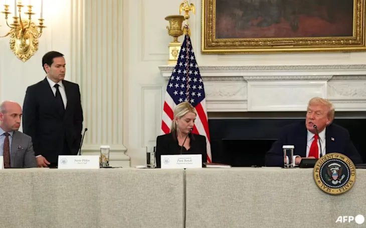 Tổng thống Trump phát biểu sau khi nhận được một ghi chú từ Ngoại trưởng Marco Rubio (thứ hai từ trái sang) liên quan đến các cuộc đàm phán hòa bình tại Gaza, ngày 8/10/2025 (Ảnh: AFP)