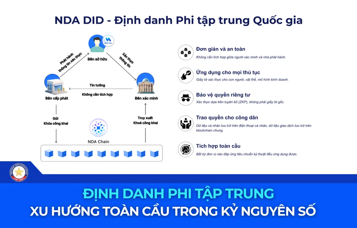 Tại Việt Nam, NDA DID là một trong những dự án tiêu biểu của Hiệp hội Dữ liệu quốc gia nhằm xây dựng hạ tầng định danh bảo mật và chủ quyền, được triển khai trên nền tảng chuỗi khối quốc gia NDA Chain. NDA DID cho phép các tổ chức phát hành – như trường học, ngân hàng, doanh nghiệp, cơ quan nhà nước – tạo lập định danh DID và cấp các giấy tờ xác thực (Verifiable Credentials – VC) cho người dùng. VC có thể là bằng cấp, giấy phép, hồ sơ y tế, hợp đồng… Người dùng lưu giữ VC trong ví cá nhân và chia sẻ bằng chứng xác thực (Proof) khi cần, bảo đảm tính minh bạch và xác minh độc lập.