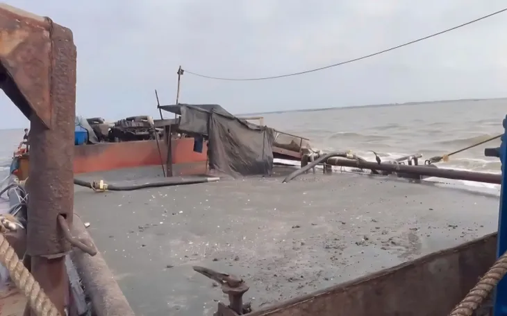 Lực lượng chức năng kiểm tra tàu vỏ sắt không có số hiệu chở cát không hóa đơn chứng từ trên biển.