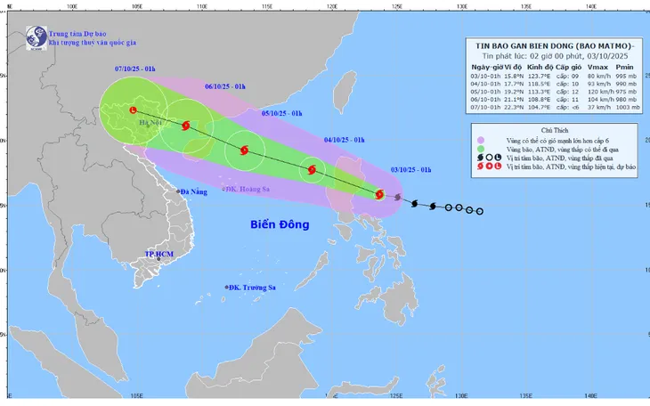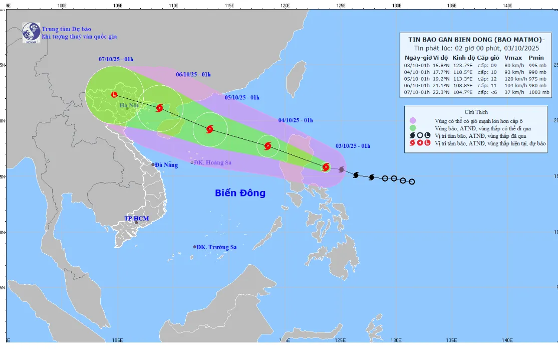 Theo Trung tâm Dự báo Khí tượng thủy văn Quốc gia, hồi 1h ngày 3/10, vị trí tâm bão ở vào khoảng 15,8 độ Vĩ Bắc; 123,7 độ Kinh Đông, trên vùng biển phía Đông đảo Luzon (Philippines). Sức gió mạnh nhất vùng gần tâm bão mạnh cấp 9 (75-88km/h), giật cấp 11. Di chuyển theo hướng Tây Tây Bắc, tốc độ khoảng 25km/h.