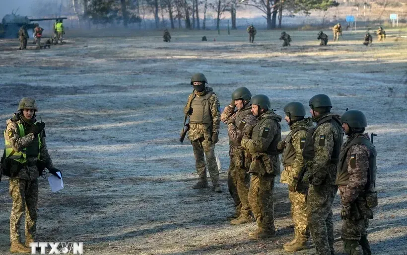 Binh sĩ Ukraine tham gia buổi huấn luyện ở ngoại ô Kiev ngày 21/11/2023 (Ảnh: AFP/TTXVN)