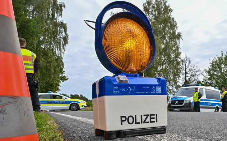 Biển cảnh báo đặt trên đường trong một cuộc kiểm tra của cảnh sát chống buôn người ở Đức, ngày 25/9/2023 (Ảnh: Getty Images)