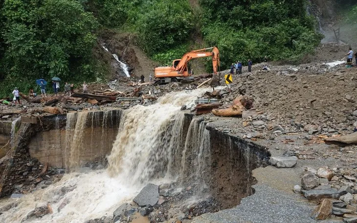 Mưa lũ gây sạt lở một đoạn đường trên Quốc lộ 32 tại khu vực đèo Khau Phạ, xã Tú Lệ, tỉnh Lào Cai, làm ách tắc giao thông đi Mù Cang Chải. (Ảnh: TTXVN)