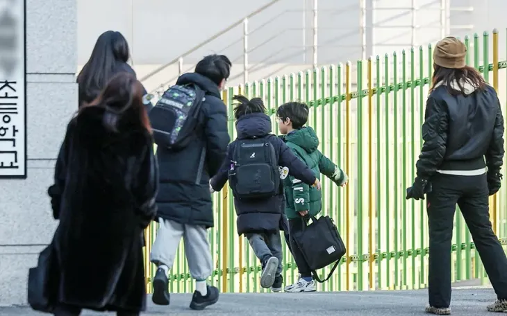 Phụ huynh đưa con đi học tại một trường tiểu học ở thành phố Seoul, Hàn Quốc (Ảnh: Chosun Biz)