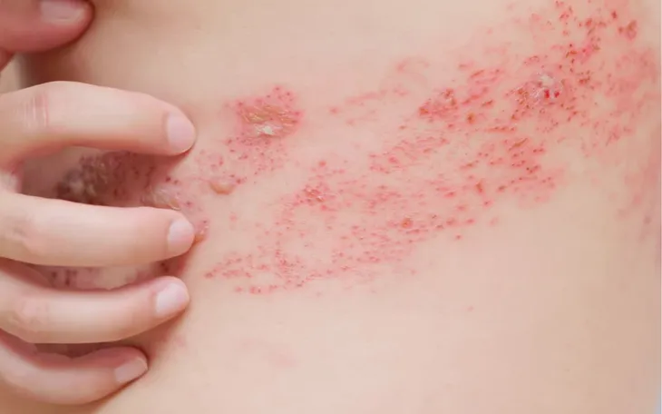 Viêm da cơ địa: Da khô, bong vảy, trẻ ngứa nhiều, có thể nổi mảng đỏ ở má, khuỷu tay, khoeo chân.