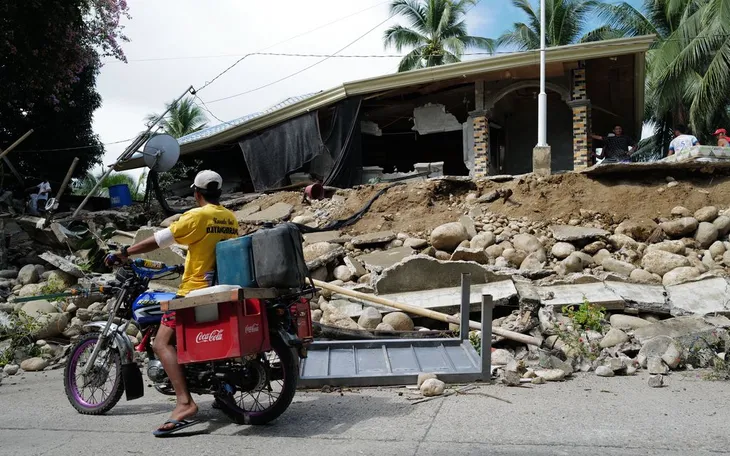 Một người đi xe máy chạy qua ngôi nhà bị hư hại sau trận động đất mạnh ở thị trấn Manay, tỉnh Davao Oriental, miền Nam Philippines, ngày 11/10/2025 (Ảnh: AP)