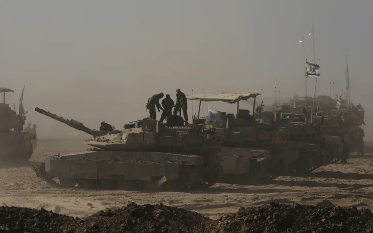 Binh lính Israel đứng trên nóc một chiếc xe tăng ở khu vực gần biên giới Israel-Gaza, ngày 18/8/2025. (Ảnh: AP)
