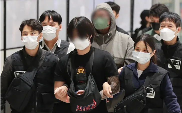 Công dân Hàn Quốc bị bắt tại Campuchia do nghi ngờ liên quan đến các vụ lừa đảo trực tuyến trở về nước, ngày 18/10/2025 (Ảnh: Yonhap)