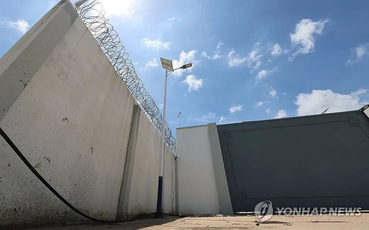Bức tường có hàng rào thép gai bao quanh một khu phức hợp tội phạm Phnom Penh, Campuchia, ngày 16/10/2025. (Ảnh: Yonhap)