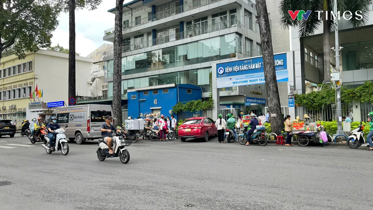 Trước cổng Bệnh viện Chợ Rẫy và Bệnh viện Răng Hàm Mặt trung ương trên đường Nguyễn Chí Thanh (phường Chợ Lớn, TP Hồ Chí Minh), quầy hàng rong và xe đẩy chiếm dụng vỉa hè, lòng đường, khiến giao thông khu vực này thường xuyên ùn ứ.