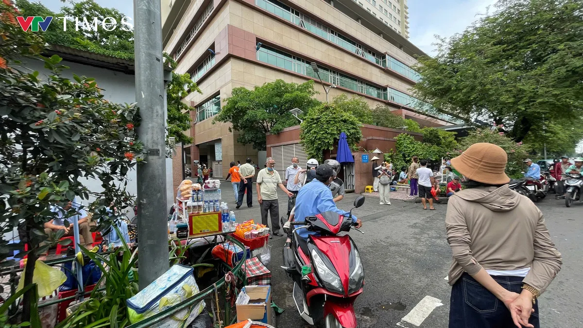 Ngay trên vỉa hè, từng chiếc xe đẩy chất đầy bánh mì, hủ tiếu, cà phê dựng sát nhau thành hàng dài. Người bán vừa chế biến vừa mời chào, khói bốc lên lẫn với mùi dầu mỡ ám đặc không khí trước cổng bệnh viện.