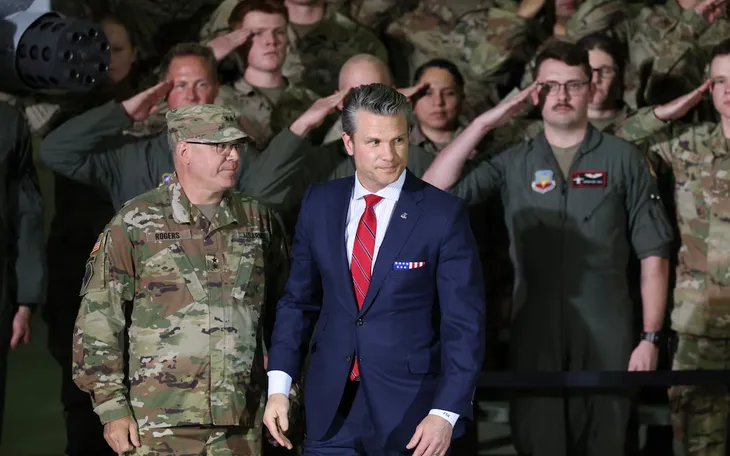 Bộ trưởng Quốc phòng Mỹ Pete Hegseth tại căn cứ Vệ binh Quốc gia Selfridge, bang Michigan (Ảnh: Getty Images)