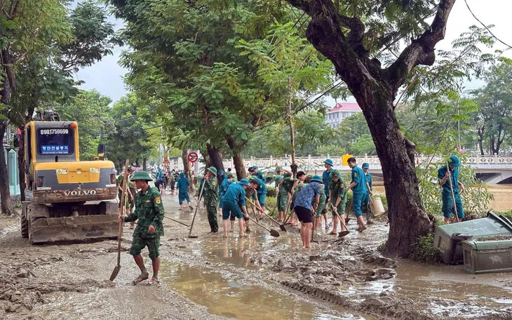 Bộ đội biên phòng TP Huế cùng với lực lượng chính quyền địa phương dọn dẹp tại đường Phan Chu Trinh, phường Thuận Hóa, TP Huế. Ảnh: VGP
